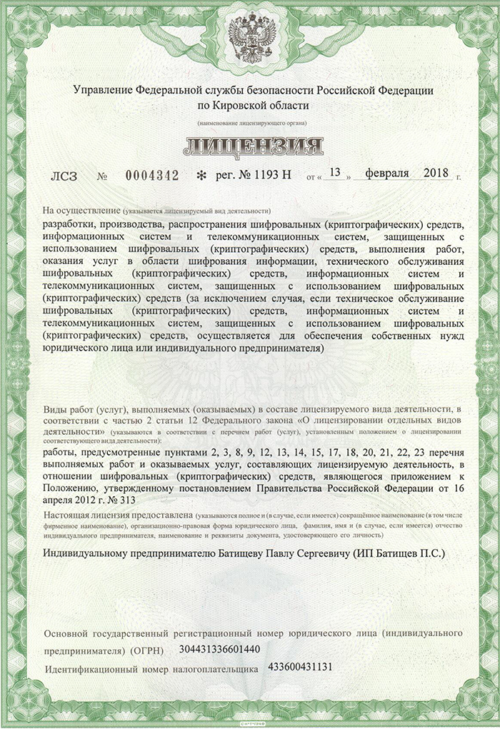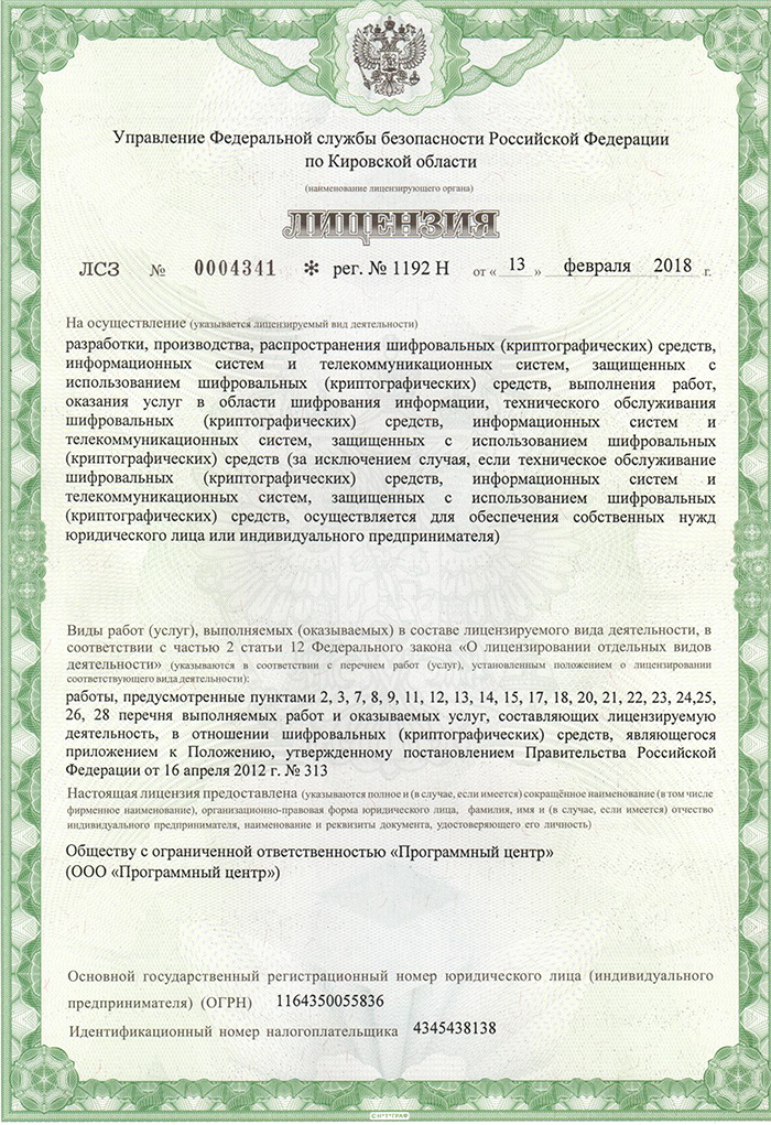 Лицензия Федеральной службы безопасности (ФСБ) – ООО «Программный центр»