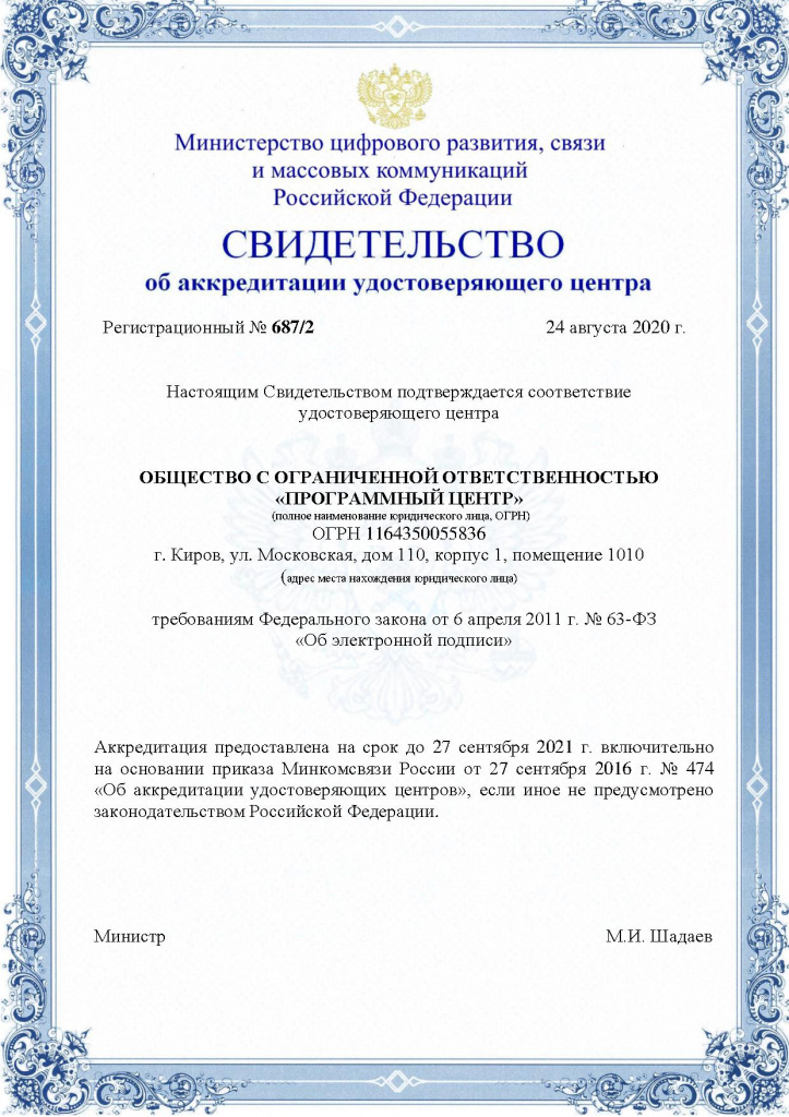 Разрешает ООО «Программный центр» встраивать в разрабатываемые информационные системы средства криптографической защиты и выдавать электронные подписи.